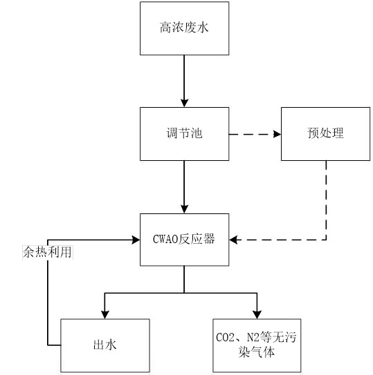 Process Description: Wastewater is preheated from the top of the reactor through the pump, pH adjustment device and preheater to the catalytic reactor bed for catalytic oxidation. The oxidant enters the catalytic reactor from the reactor side in batches to give full play to its oxidation capacity , After the end of the catalytic reaction, the treated wastewater is discharged from the bottom of the catalytic oxidation bed, and the resulting exhaust gas such as CO2 is discharged from the top of the catalytic reaction bed.