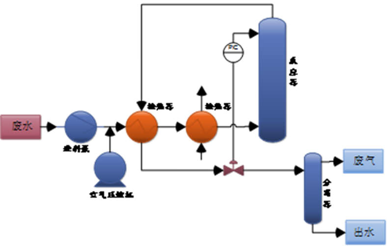 Process Description: Wastewater is pressurized by a high-pressure feed pump and mixed with air from an air compressor. Heat is transferred to the heat exchanger and heat from the reactor to heat the heat and then into the secondary heat exchanger. Temperature, into the oxidation reactor. The organic matter in the wastewater is oxidized and the heat released by the reaction keeps the temperature of the mixed liquid constant. The temperature of the liquid flowing out of the reactor is high and the pressure is high, cooled in the heat exchanger, and the heat recovered during the reaction is used for the preheating of most of the wastewater. After cooling the liquid through the pressure control valve step-down, the liquid separation in the separator gas, liquid two-phase.