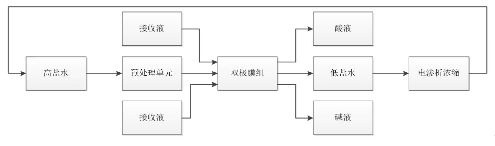 Process Description: High salt wastewater after pretreatment, after entering the bipolar membrane system. Under the action of the electric field, the bipolar membrane system converts the salt into the corresponding acid and base, and the acid and alkali concentration is about 8-10%, which can be reused in the production process. When the salt concentration in the bipolar membrane system decreases To 5% or less, after electrodialysis concentrated, back to the pretreatment unit into the bipolar membrane system.